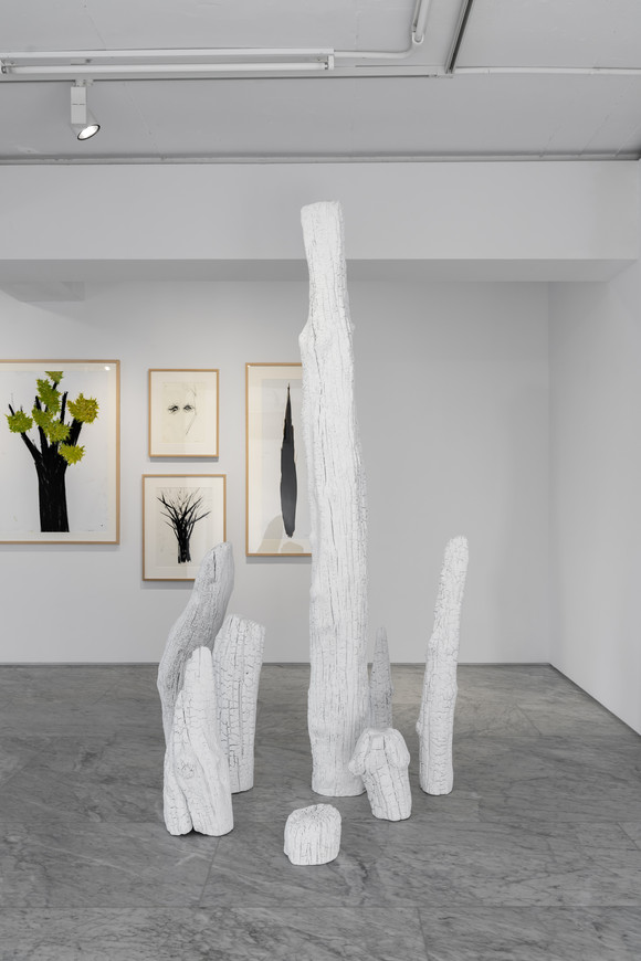 전시장에 함께 놓인 숯 조각은 2019년 고성 산불 당시 타버린 나무로 제작한 작업으로, 작가는 불의의 사고로 생명을 다한 나무를 죽은 몸에 화장(메이크업)하듯 다시 불로 정성스레 다듬었다. 나아가 이와 같은 장례 행위를, 얼굴을 단장하는 화장으로 확장하여, 작업의 몸체에 흰 분을 입히듯 마지막 모습을 매만졌다.