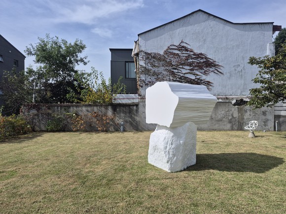 야외 정원에 설치된 신작 대형 조각은 청계천 수표교의 교각을 모티브로 한 작품이다. 수표교는 조선시대에 수량 측정을 위해 청계천에 세워졌으나, 하천의 복개와 복원을 거치며 현재는 장충단공원에 버려지듯 남아있는 상태이다. 작가는 사람들이 관심을 두지 않는 수표교의 하단 교각에 주목하고, 별다른 기교 없이 무심하게 만들어진 형태와 다듬어지지 않은 돌의 표면에서 ‘세월을 견딘, 가장 한국적인 미감의 형태와 질감’을 발견한다. 그는 이 육중한 석조 교각을 3D 스캔을 통해 데이터로 변환하여 조합한 후, 알루미늄 조각으로 재탄생시켰다. 여기서 교각의 모양을 데이터상에서 잡아 늘여 만든 조각 상단의 물결과 같은 형태는 수표교가 원래 놓였던 하천이라는 장소의 상징성과 함께 과거로부터 현재까지 흐르는 시간과 역사를 상기시킨다.