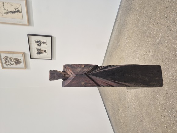 사람의 형상을 한 침목으로 만든 작품이 눈에 띈다. 정현 작가는 철도 레일에 10년 이상 짓눌려 있던 침목의 ‘견딤’의 속성에 반했다고 한다. 어린 시절 그는 철길 옆에 살았다. 탱크나 장갑차 같은 싣고 가는 기차의 무게감, 공포뿐만 아니라 기차가 지나갈 때 꺼졌다가 다시 올라오는 리듬감을 기억한다. 무게와 시련을 견뎌내고 결국 소멸되는 침목에 작가는 매료됐다.
