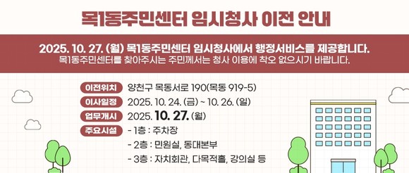 서울 양천구(구청장 이기재)는 건립 후 35년이 지나 노후화된 목1동 주민센터 신축을 추진하기 위해, 오는 10월 27일(월)부터 임시청사로 이전해 업무를 개시한다고 밝혔다.
