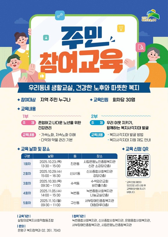 서울 은평구(구청장 김미경)는 주민 참여 교육 ‘우리동네 생활 교실, 건강한 노후와 따뜻한 복지’를 운영하고 신청자를 모집한다고 밝혔다.