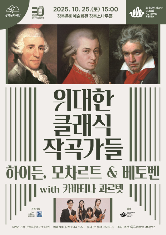 서강석 강북문화재단 대표이사는 “이번 ‘위대한 클래식 작곡가들’ 시리즈는 지역주민들이 일상 속에서 수준 높은 클래식을 접할 수 있도록 기획한 공연”이라며 “첫 무대를 시작으로 12월까지 이어지는 명곡 시리즈를 통해 클래식 음악의 깊은 울림을 함께 느껴보시길 바란다”고 밝혔다.