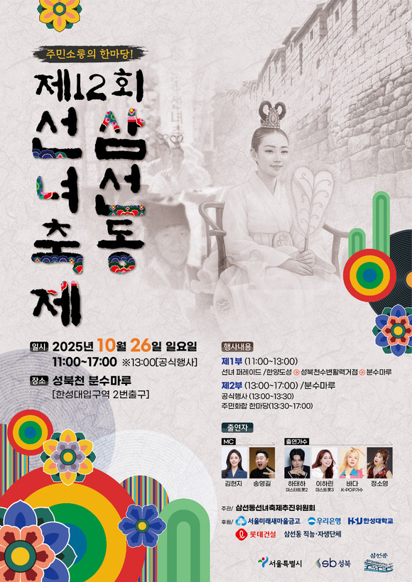 한편, 올해로 12회를 맞은 삼선동 선녀축제는 지역 전통 계승과 주민 소통의 한마당으로 자리매김하며, K-컬처와 연계한 새로운 지역문화 모델로 발전 가능성을 보여줄 것으로 기대된다.