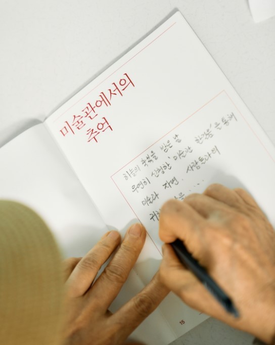 〈일상예찬: 함께 만드는 미술관〉은 인지장애 시니어와 가족의 정서적 교류와 인지 기능 활성화를 위한 프로그램이다. 국립현대미술관과 대한치매학회는 2015년 첫 업무 협약을 맺은 이래 매년 인지장애 시니어의 문화예술 경험과 일상으로 회복을 지원하는 데 힘써왔다. 프로그램은 ‘감상, 표현활동, 산책하기’ 구성으로 진행되어 먼저 서울관 상설전 《한국현대미술 하이라이트》 주요 작품을 감상하며 뇌와 마음의 자극을 돕는다. 작품 감상 후에는 국립현대미술관이 개발하고 대한치매학회 전문가 자문으로 제작된 교재와 미술재료를 활용한 표현 활동이 이어진다. 교재는 미술관에서 감상한 작품을 환기하며 색과 형태를 표현하고 이야기를 나누는 활동으로 구성되어 있다. 색을 고르거나 입체적으로 만드는 활동은 인지장애 환자의 인지기능과 집중력을 자극하고 말하기 어려운 감정을 표현하도록 유도한다. 또한 인지장애 환자와 가족 동반자가 함께 짝을 이루어 그림을 그리거나 이야기하는 것은 사회적 소통과 자존감 회복에 도움을 준다.