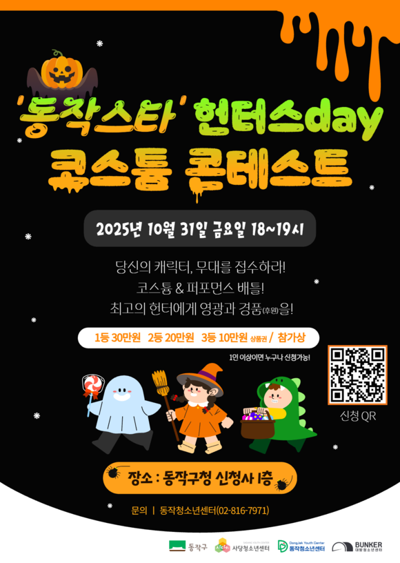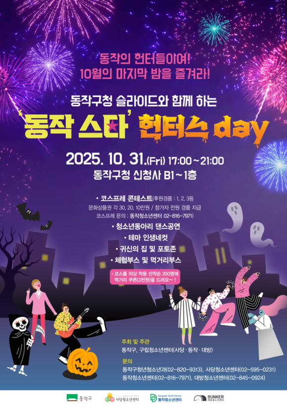 서울 동작구(구청장 박일하)가 오는 10월 31일(금) 오후 5시부터 9시까지, 구청 신청사에서 청소년이 직접 기획하고 운영하는 제1회 핼러윈 축제「‘동작 스타’ 헌터스day」를 개최한다고 밝혔다.
