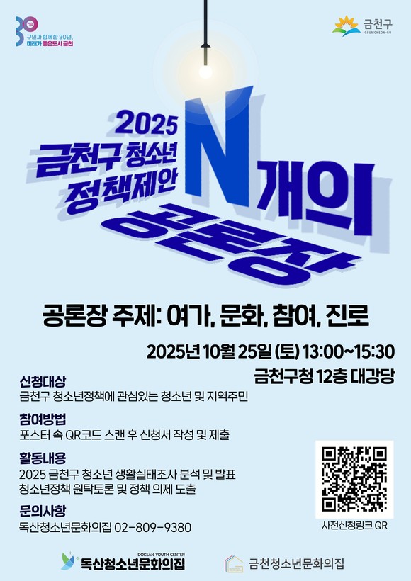 물론 청소년 정책에 관심있는 관내 중·고등학생 누구나 참여할 수 있다. 2025 금천구 청소년 정책토론회 ‘N개의 공론장’에 참여하는 방법은 포스터 속 정보무늬(QR코드) 및 신청링크를 통해 신청하면 된다.