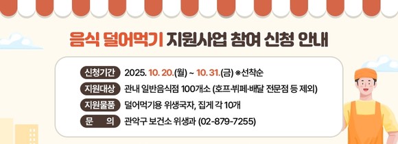 신청기간은 10월 31일까지이며, 선착순 마감한다. 신청방법은 관악구청 홈페이지에서 신청서를 내려받아 작성한 후, 관악구청 위생과 방문 또는 담당자 이메일로 제출하면 된다.