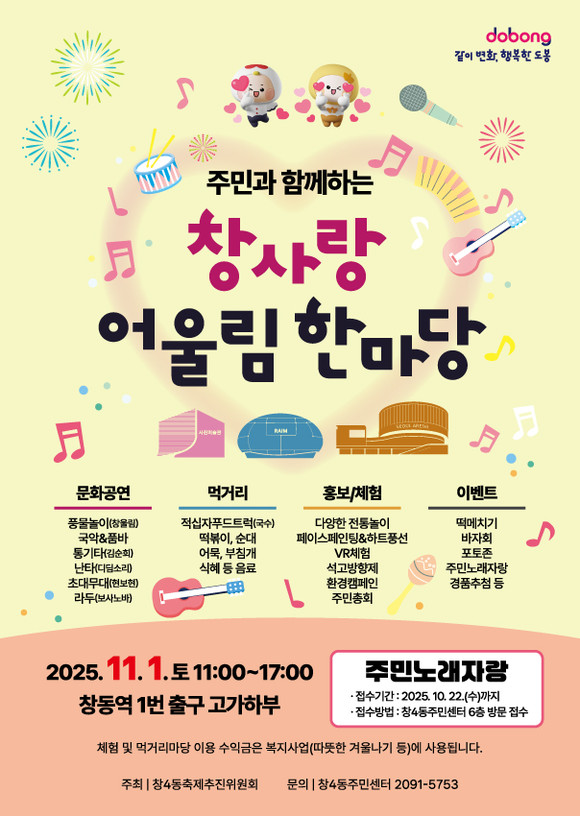서울 도봉구(구청장 오언석) 창4동이 오는 11월 1일 오전 11시 창동역 1번출구 고가하부 일대에서 ‘창사랑 어울림 한마당’ 축제를 개최한다.