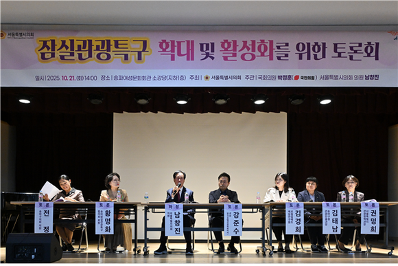 이날 토론회는 서울시의회가 주최하고 박정훈 국회의원과 남 의원이 공동으로 주관해 개최했으며 안양대학교 교수로 재직 중이면서 한국호텔관광학회 이사로 활동하고 있는 강준수 교수가 확대 및 활성화를 위한 발제를 하고 전정 송파구의원, 황명화 송파잠실관광특구협의회 회장, 로컬임팩트 김경희 선임연구위원(한양대 겸임교수), 송파구 관광진흥과장, 서울시 관광정책과장이 토론자로 참석했다. 1부 사회는 김광철 송파구의원이 맡았다.