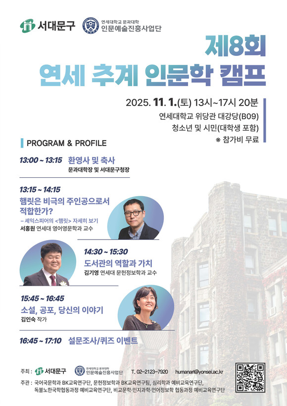 서울 서대문구(구청장 이성헌)가 연세대학교 문과대학(학장 김장환)과 공동으로 11월 1일 오후 1시부터 5시 20분까지 연세대 위당관 대강당(B09호)에서 ‘제8회 연세 인문학 캠프’를 개최한다. 이 행사는 2023년 1월 시작돼 이번에 8회를 맞았다.