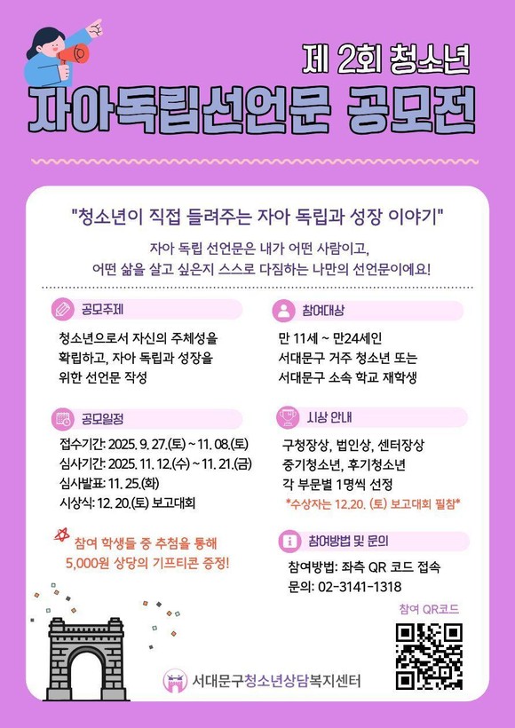 서울 서대문구(구청장 이성헌)가 위탁 운영하는 서대문구청소년상담복지센터가 청소년의 건강한 자기 이해와 주체적 성장 지원을 위해 ‘제2회 청소년 자아독립선언문’을 공모한다.