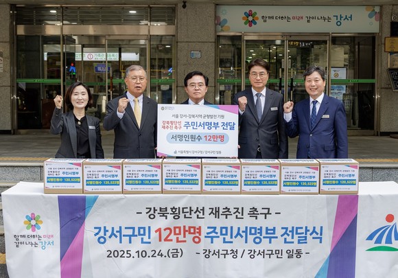 서울 강서구(구청장 진교훈)는 24일(금) 강북횡단선 신속 재추진을 위한 12만 주민 서명부 전달식을 개최했다.