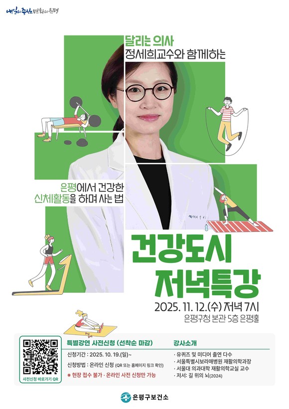 이번 특강의 주제는 ‘은평에서 건강한 신체활동을 하며 사는 법’으로, 일상에서 실천할 수 있는 유산소 운동과 근력 운동 방법, 그리고 달리기가 몸과 마음에 주는 치유 효과 등을 쉽고 흥미롭게 전할 예정이다.