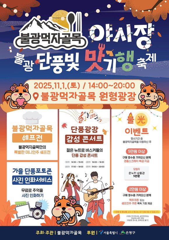 오후 2시부터 8시까지는 불광먹자골목 상점 10여 곳이 참여하는 ‘가을 야시장 셰프전’이 열린다. 상점별 대표 메뉴를 활용한 무료 시식과 판매 부스가 열리며 단풍 포토존, 즉석 사진 인화 서비스 등 다양한 즐길 거리가 마련된다.