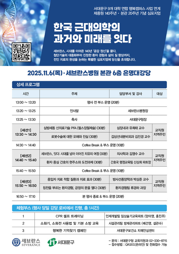 ▲‘세션1’은 ‘심방세동 신의료기술인 펄스장절제술’ 및 ‘로봇수술에 대한 오해와 진실’ ▲‘세션2’는 ‘세브란스, 잇다: 시대를 넘어 이어진 치유의 여정’ 및 ‘환자 중심 간호의 현주소와 도전과제’ ▲‘세션3’은 ‘중입자 치료 적합 질환과 치료 효과’ 및 ‘칭찬을 부르는 환자 경험, 긍정의 문을 열다’란 제목으로 강의가 이뤄진다.