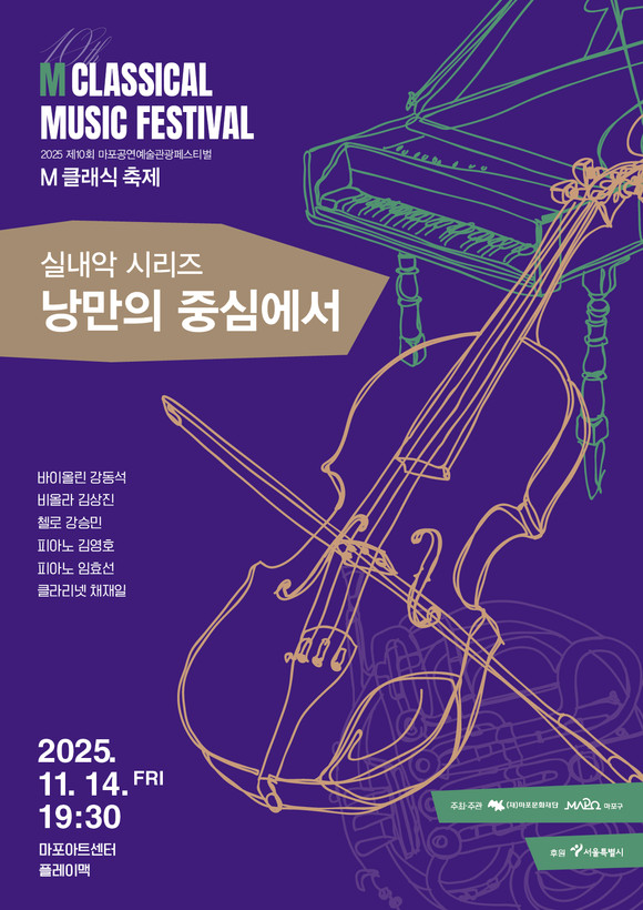 서울 마포문화재단(대표이사 고영근)은 11월 14일 실내악시리즈 <낭만의 중심에서>를 개최한다. 2025년 제10회 M 클래식 축제의 일환으로 진행되는 이번 공연은 바이올리니스트 강동석을 중심으로 클래식 거장들이 함께 실내악의 정수를 담은 무대를 선보인다.