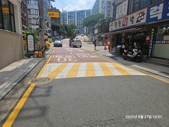 먼저 서일초등학교 일대는 주택가를 우회하는 차량의 과속으로 보행자 안전이 위협받던 구간이다. 이 문제는 전성수 서초구청장이 주민과 직접 소통하는 ‘동네한바퀴(서초1동)’ 현장에서 주민들이 제기한 건의사항이기도 하다. 구는 정문 앞에는 횡단보도를, 신호등이 없던 구간에는 보행신호등을 새로 설치했다. 또 주변 도로의 제한속도를 시속 20km로 낮추고 과속방지턱 8개를 신설해 차량 서행을 유도하는 등 보행 안전성을 한층 높였다.