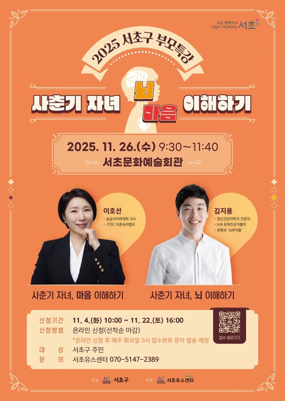 서울 서초구(구청장 전성수)는 11월 26일 서초문화예술회관 아트홀에서 개최되는 사춘기 자녀를 이해하고 좋은 부모가 되기 위한 ‘2025년 서초구 부모특강’을 앞두고 오는 4일부터 접수를 시작한다고 밝혔다.