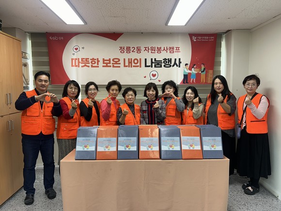 장숙자 정릉2동 자원봉사캠프장은 “추워지는 계절에 어르신들이 조금이나마 따뜻하게 겨울을 나시길 바라는 마음으로 준비했다”며 “앞으로도 지역사회의 어려운 이웃에게 온정을 전하는 나눔활동을 지속해 나가겠다”고 말했다.