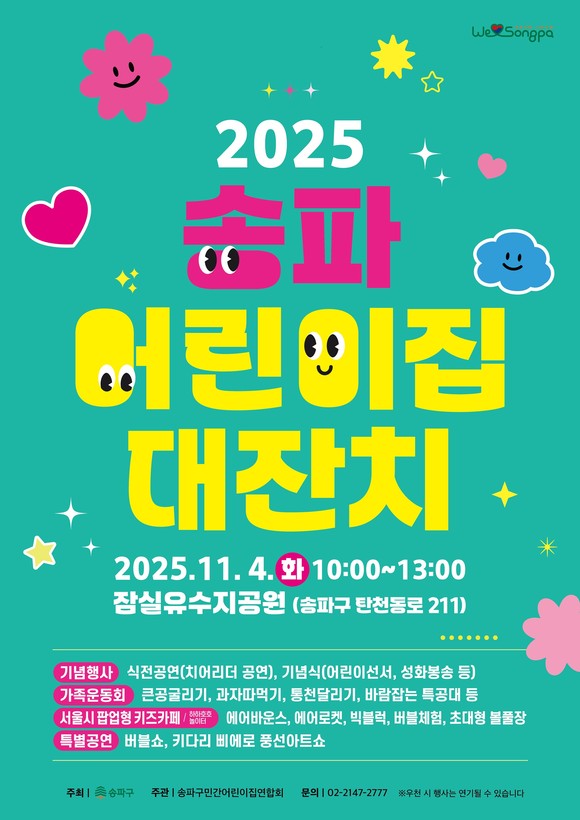 서울 송파구(구청장 서강석)는 오는 11월 4일(화) 10시부터 13시까지 잠실유수지공원(탄천동로 211)에서 ‘2025 송파 어린이집 대잔치’를 개최한다고 밝혔다.