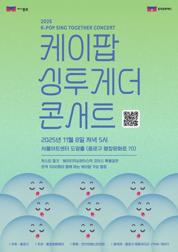 서울 종로구(구청장 정문헌)는 11월 8일 17시 서울아트센터 도암홀(평창문화로 70)에서 ‘케이팝 싱투게더 콘서트’를 개최한다.
