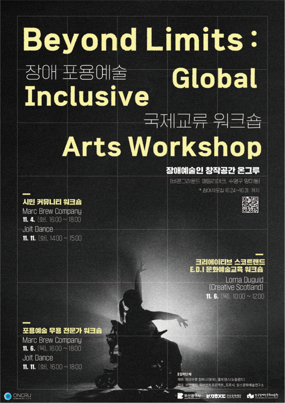 부산문화재단(BSCF, 대표이사 오재환)은 오는 11월 4일(화)부터 11월 11일(화)까지 장애예술인 창작공간 온그루에서 영국과 뉴질랜드의 장애예술 단체를 초청해 장애 포용예술 국제교류 워크숍을 개최한다. 워크숍은 장애와 비장애, 예술가와 시민이 함께 해외 포용예술 사례를 나누고 지속 가능한 교류 기반을 마련하는 데 목적이 있다.