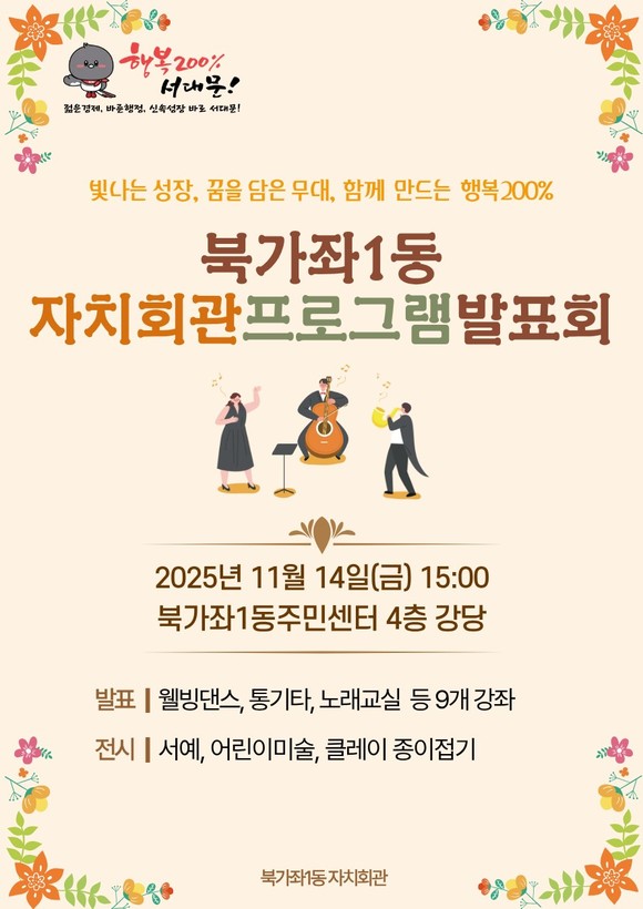 김종일 북가좌1동장은 “이번 축제는 주민들께서 함께 즐기고 소통하며 공동체 의식을 다지는 화합의 장이 될 것”이라며 “주민 문화 향유와 자치 역량 강화를 위한 자치회관 프로그램에 앞으로도 많은 관심과 참여를 부탁드린다”고 전했다.
