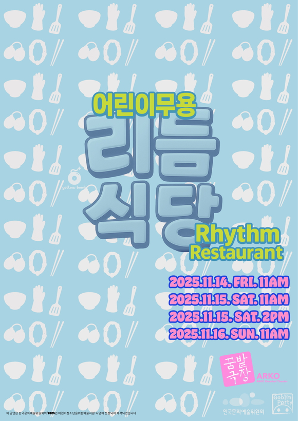 고블린파티는 현대무용 공연 <리듬식당>을 아르코꿈밭극장에서 선보인다. 세계 여러 나라의 요리 과정을 리듬과 움직임으로 표현하며 각 나라의 문화적 특색을 현대무용을 통해 경험할 수 있게 돕는다. 어린이 관객은 다양한 문화의 매력과 함께 현대무용을 자연스럽게 접할 수 있는 기회를 가진다. 공연은 11월 14일부터 11월 16일까지 진행된다.
