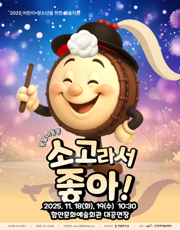 수도권 외 지역에서도 공연이 진행된다. 풍물패청음은 <풍물이 동동, 소고라서 좋아!>를 함안문화예술회관에서 공연한다. 소리가 작고 몸집이 왜소한 소고가 스스로의 가치를 발견하고 자존감을 찾아가는 과정을 어린이의 눈높이에 맞추어 풀어낸다. 풍물악기의 연주, 미디어아트, 그리고 LED 퍼포먼스와 함께 웃고 즐기며 자존감을 키워가는 특별한 경험을 선사한다. 공연은 오는 11월 18일부터 11월 19일까지 만나볼 수 있다.