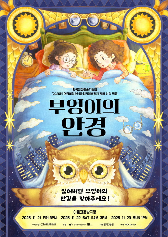 다크서클즈컨템포러리는 무용극 <부엉이의 안경>을 통해 수많은 새들이 인공구조물에 부딪혀 목숨을 잃는 현실에 주목한다. 빌딩숲 속 동네친구들과 부엉이의 안경을 찾으러 떠난 자매의 이야기를 무용과 함께 즐기며, 인간의 활동으로 인해 발생하는 생명의 피해에 대해 다시금 생각해볼 수 있다. 공연은 11월 21일부터 11월 23일까지 아르코꿈밭극장에서 진행된다.