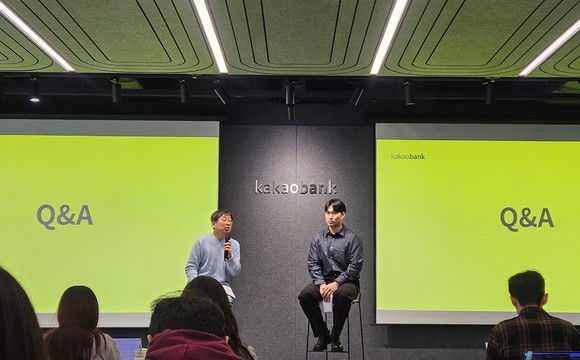 조진현 신용리스크모델링팀장(왼쪽)이 카카오뱅크 회의장에서 열린 기자간담회에서 질의에 응답하고 있다. 사진=김예은 기자