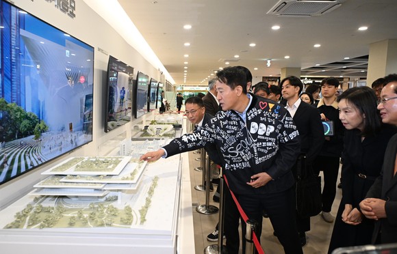 오세훈 서울시장이 10일 종로구 세종문화회관에서 열린 '제2세종문화회관 건립 설계공모 시상식'에서 설계안 당선작 '디자인캠프문박디엠피' 모형을 살펴보고 있다. 사진=서울시청