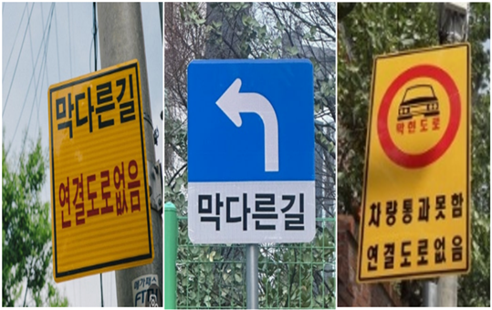 따라서 막다른 도로마다 표지판 형태가 제각각이어서 초행길 운전자는 혼동하기 쉽고, 정확한 정보를 인지하지 못하면 잘못된 진입이나 사고로 이어져 지역 주민의 생활과 안전을 위협할 수 있다.