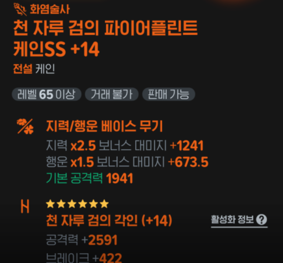 무기 룬 ‘천자루의 검’을 무기 장비에 각인 후 강화한 모습.