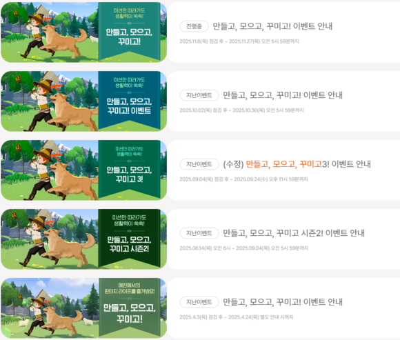 심지어 생활 콘텐츠 관련 이벤트 운영 역시 형식적이라는 지적이 나온다. 넥슨은 ‘만들고, 모으고, 꾸미고!’ 시리즈를 수차례 반복 진행하고 있지만, 매번 보상 구성과 진행 방식이 거의 동일하다.