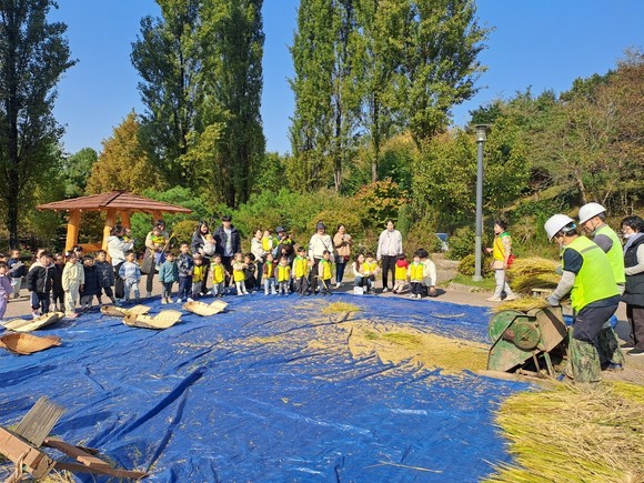 서울 강동구(구청장 이수희)는 일자산근린공원에 위치한 다랭이논(둔촌동 산119)에서 아이들과 함께 탈곡 및 추수하기 체험을 진행했다고 13일 밝혔다.