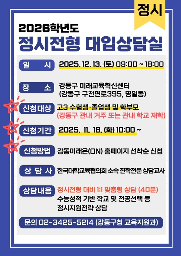 서울 강동구(구청장 이수희)는 오는 12월 13일(토), 수험생들의 효율적인 정시 지원 전략 수립을 돕기 위한 ‘2026학년도 정시전형 대입상담실’을 운영한다고 13일 밝혔다.