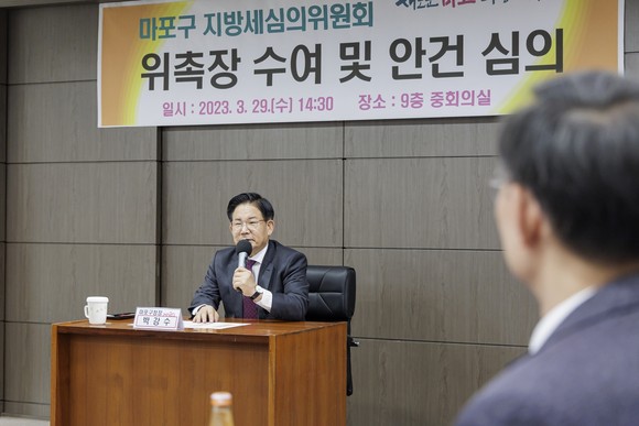 지방세심의위원회에서 안건 사항에 대해 말하는 박강수 마포구청장. 사진=마포구청