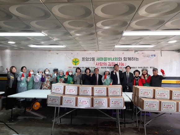 돈암2동 새마을부녀회(회장 이길순)는 14일 주민센터 주차장에서 ‘사랑의 김장 나눔’ 행사를 열고 독거어르신 및 복지사각지대 50가구에 전달할 김장김치를 마련했다. 이른 아침부터 모인 부녀회 회원들은 정성스럽게 배추를 다듬고 양념을 버무리며 이웃 사랑의 마음을 김치에 담았다.