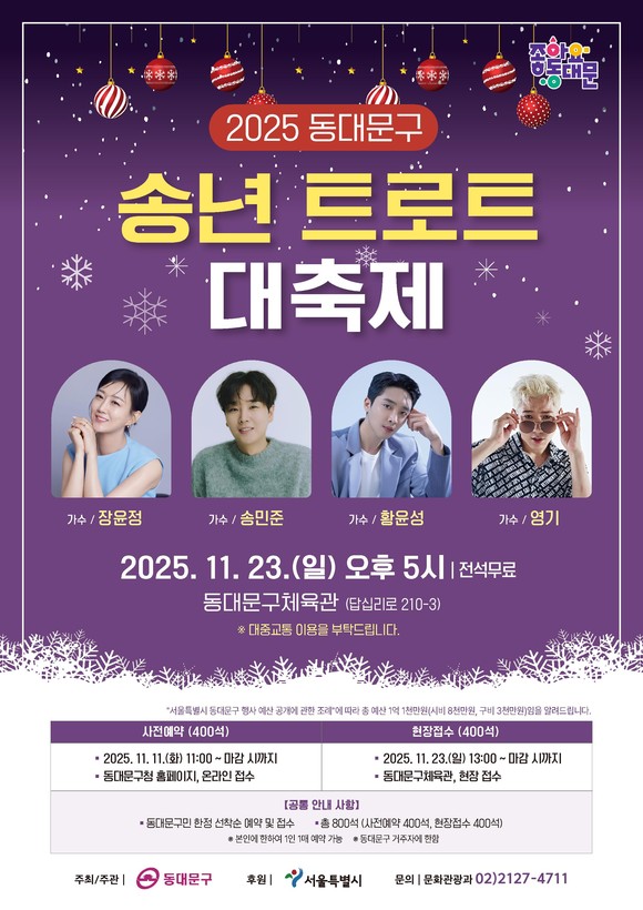 동대문구가 주최·주관하고 서울시가 후원하는 이번 축제에는 트로트 스타 장윤정, 송민준, 황윤성, 영기가 무대에 올라 겨울밤을 뜨겁게 달굴 예정이다.