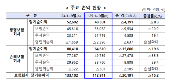 금융감독원이 올해 1~9월 보험회사 당기순이익이 전년 동기 대비 15.2% 감소한 11조 2911억원을 기록했다고 19일 밝혔다. 손해보험사의 보험손익이 크게 악화한 것이 전체 순이익 감소의 주요 요인으로 나타났다.