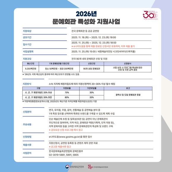 문화체육관광부(장관 최휘영)와 한국문화예술회관연합회(이하 코카카)는 지역 문예회관의 기획・제작 역량을 강화하고 지역 문화예술 활성화 기반을 마련하기 위해 ‘2026년 문예회관 특성화 지원 사업’을 대폭 확대・개편해 추진한다. 2026년 사업 공모 접수는 11월 25일부터 12월 23일까지 진행된다.