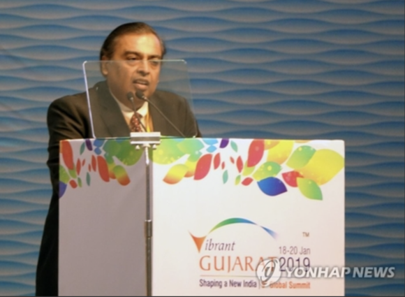 무케시 암바니 인도 릴라이언스그룹 회장이 18일 인도 북서부 구자라트 주 주도 간디나가르의 마하트마 만디르 컨벤션센터에서 열린 '인도 구자라트 투자서밋(VGS 2019)' 개막식에서 축사하고 있다. 사진=연합뉴스
