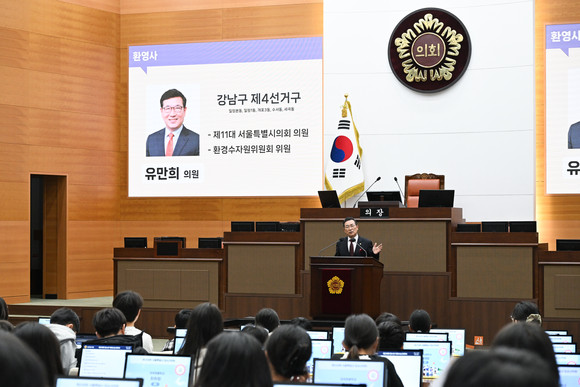 서울특별시의회 환경수자원위원회 유만희 의원(강남4, 국민의힘)이 25일 서울특별시의회 본회의장에서 열린 ‘찾아오는 청소년 의회아카데미’ 프로그램에 참여한 자곡초등학교 6학년 학생 89명을 맞이해, 지방의회의 역할과 기능, 그리고 시의원의 역할에 대해 설명하는 시간을 가졌다.