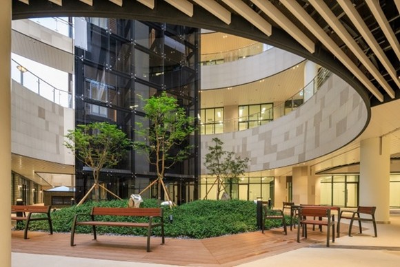 외관은 어두운 톤의 주조색과 보조색으로 차분하고 고급스러운 이미지를 연출했고, 커튼월의 유리 마감과 태양광발전시스템(BIPV), 저층부의 벽돌과 석재 등 다른 질감의 소재들로 조화를 이루며 묵직한 대비를 구현했다.