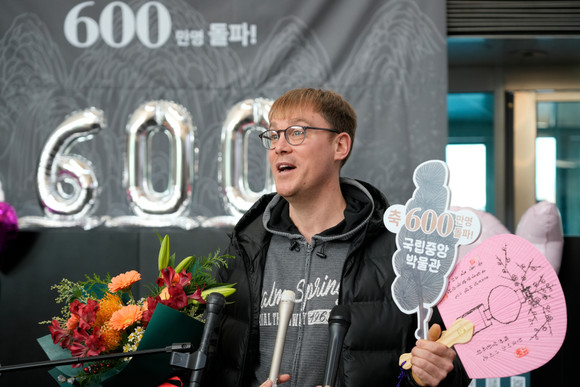 국립중앙박물관은 관람객 600만 명 돌파를 기념해 12월 11일 오후 2시, 600만 번째 관람객에게 유홍준 관장이 직접 선물을 전달하는 축하 행사를 진행했다. 행운의 주인공은 분당구 판교동에서 온 노용욱(만 40세) 씨로, 쌍둥이 자녀와 함께 가족 4명이 방문해 뜻깊은 순간을 맞이했다. 노용욱 씨는 “특별전 ‘인상주의에서 초기 모더니즘까지’와 어린이박물관을 보기 위해 박물관에 처음 방문했다. SNS를 통해 어린이박물관을 포함한 박물관 공간을 아이들이 좋아한다는 이야기를 듣고 오게 됐는데 이렇게 600만 번째 관람객이 되어 기쁘다”고 말했다.