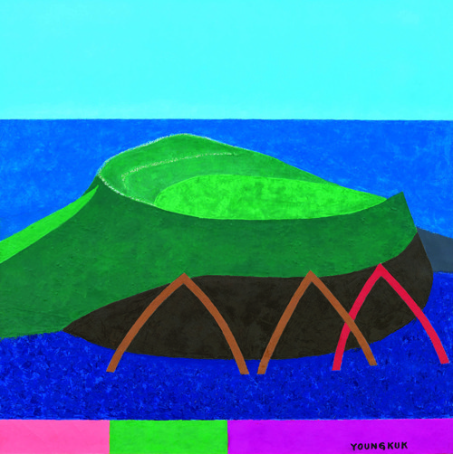 114점, 약 160억 원 상당의 작품이 출품되는 이번 경매의 표지작은 유영국의 작품 ‘워크(Work)’가 장식했다. 1984년에 제작된 이 작품은 작가의 후기 미학을 압축적으로 보여주는 수작으로, 하늘과 바다의 수평선 구조 위에 타원형의 분화구와 완만한 능선으로 단순화된 거대한 산이 하나의 색면처럼 자리하며 화면의 중심을 차지한다. 또 산 아래 반복되는 아치형 구조와 하단의 색면은 풍경에 구조적 리듬과 장식적인 요소를 더한다.