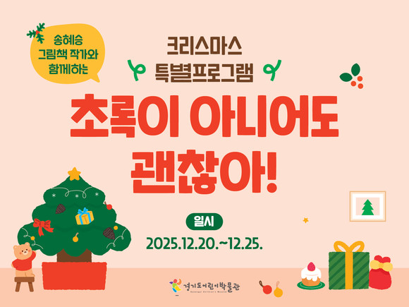 경기도어린이박물관(관장 박균수)은 크리스마스를 맞아 특별 프로그램 ‘초록이 아니어도 괜찮아!’를 운영한다. 지난 10월 ‘문화다양성 그림책 야외체험전’ 참여작가인 송혜승 그림책 작가와 함께하는 이번 프로그램은 문화다양성 교육의 일환으로 기획되었으며, ▲다문화가족 어린이(초3~6) 대상 ‘크리스마스 트리 만들기’ ▲일반 관람객 대상 ‘알록달록 솔방울 꾸미기’ 두 가지로 구성된다.