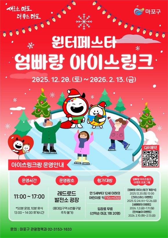 서울 마포구(구청장 박강수)는 겨울을 맞아 레드로드 발전소 광장에 ‘윈터페스타 엄빠랑 아이스링크’를 조성하고 12월 20일 개장한다.