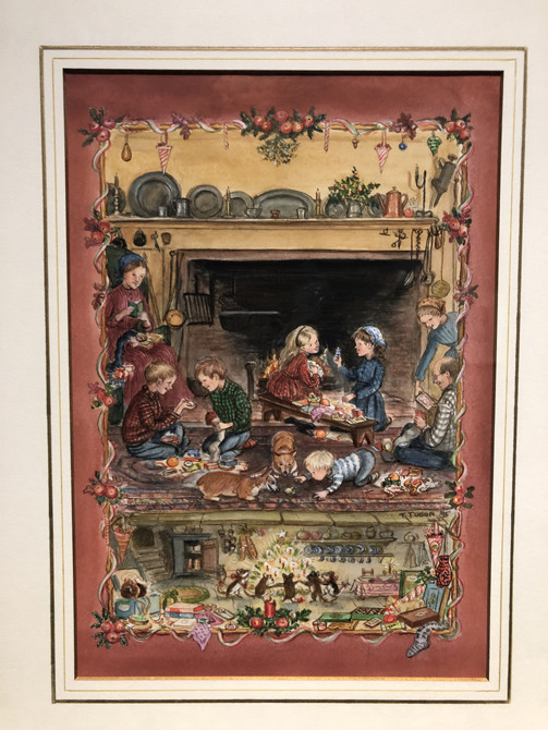 벽난로 앞에 설치된 의자와 여러 인형, 그릇들 소품이 공간에 따뜻함을 불어넣는다. 그림 속 서로를 바라보며 미소 짓는 사람들과 함께 어우러지는 동물, 식물의 풍경도 훈훈하다. 마치 한 공간에 겨울에 이어 봄이 이미 찾아온 느낌도 든다.